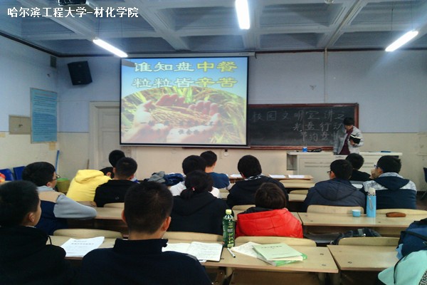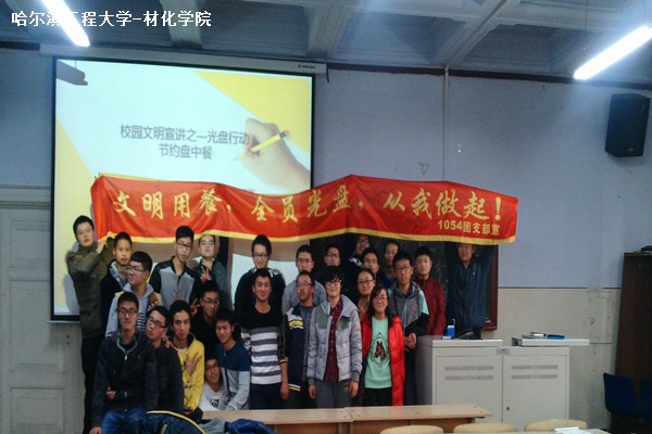 本次宣讲分为两个环节进行。第一个环节是团支书就文明就餐中的光盘行动宣讲。首先由当今中国和世界存在的浪费粮食现状引出光盘行动,进而阐述了光盘行动的定义,内涵。随后向全班同学发出呼吁:一粥一饭当思来之不易;半丝半缕,恒念物力维艰。并号召同学们珍惜粮食,拒绝浪费。我班同学积极响应号召,签订了光盘行动,拒绝浪费粮食的条约,并在条幅上签下了自己的名字。第二个环节是团支书宣讲寝室,班级文明公约,随后组织同学们在此公约上签字以履行职责。同学们纷纷签下协议,承诺做文明人,共建文明校园。这两个环节结束之后,团支书又就本次校园文明宣讲会进行总结,再次强调了校园文明建设的重要性。