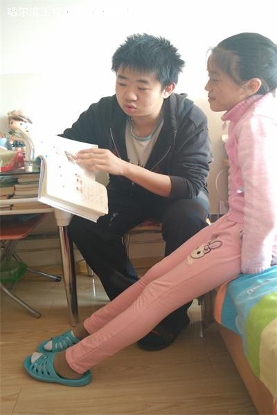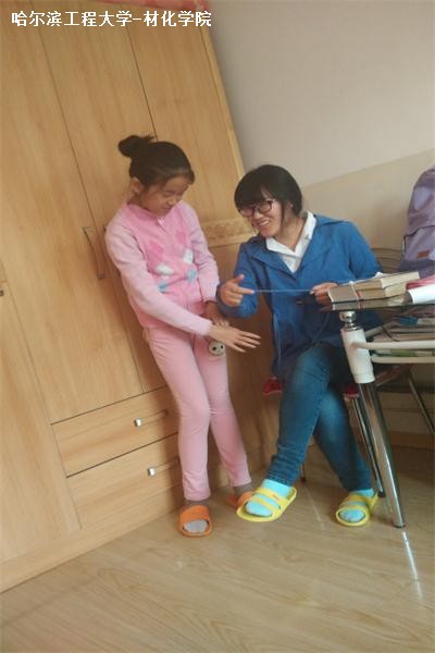 尹可很高兴我们又去看她,还抱怨我们为什么隔了这么久才去。我们给她带来新鲜水果,还送给她书签、海报。我们询问了尹可近来的学习情况如何,有什么地方学不懂的。她给我们看了她的课本和作业,我们分别帮忙检查作业,把难懂的地方好好给她讲解,尹可的数学成绩相对于其他科目要差一些,我们重点给她讲解了数学的一些问题。她也不时的给我们讲她在学校里一些有趣的事情。中间,她还给我们表演了她刚学习的拉丁舞蹈,还向李岩姐姐学习了如何打蝴蝶结。整个学习过程,尹可一直都是很开心的,有说有笑。