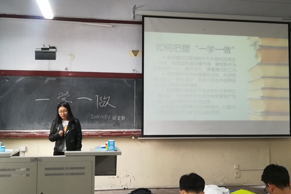 活动由团支书带领大家回顾习近平总书记的一学一做的主题讲话,让大家简单了解什么是一学一做。之后通过ppt从一学一做的意义,目的,指导思想,诠释等方面深刻剖析了什么是一学一做。同学们认真的听着,并且作为共青团的一员同学们也想为祖国做出贡献。活动的后期团支书阐述了从3到9月学习一学一做系列讲话,大家需要做什么来提高自己的能力,培养自己的品质。同学们听了以后跃跃欲试,希望可以在之后的活动中崭露头角。