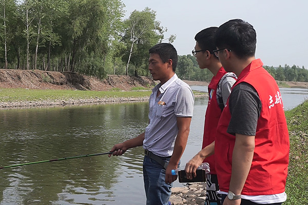 最后,实践团对岸边钓鱼的刘大爷进行采访调查。刘大爷告诉实践团:“龙兴镇当地已经很久没有下雨了,今年只下了两次雨,河里的水越来越少,很少有鱼了,今天一早上只钓到两条小鱼。”