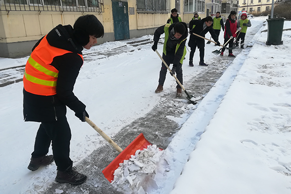 为方便社区居民出行,保证行人出行安全。12月11日下午一点,材化学院团委实践部组织志愿者前往工程大学社区开展志愿扫雪活动。本次活动由实践部部长刘安英带队,共有15名志愿者参加。