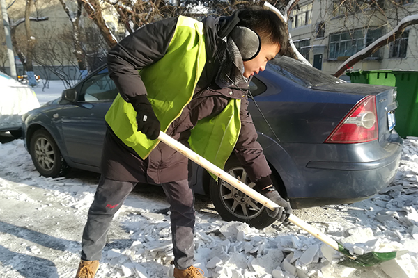 到达社区之后,由社区工作人员给志愿者发放了志愿者衣物手套和除雪工具。在分配完除雪工具和相关工作任务后,志愿者投入到了本次的活动中。本次活动的任务量较大,而且大雪过后天气较为寒冷,但志愿者不惧严寒全身心地投入到了活动中,面对较难处理的道路积雪,志愿者合理利用扫把,铁锹等工具对积雪进行彻底的处理最后经过志愿者半个小时的努力,路面积雪被打扫干净,居民的出行安全有了保证。
