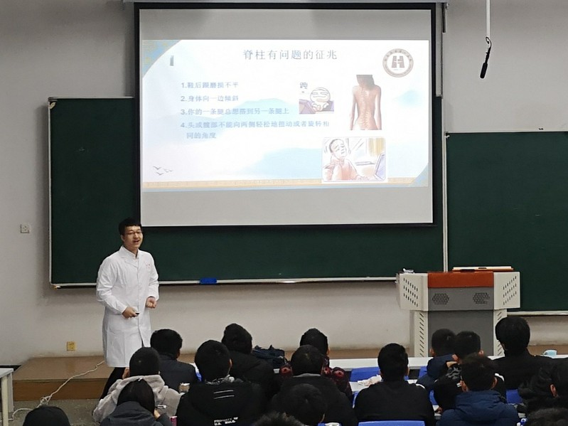 随后,齐鹏飞医师对骨科知识进行讲解。齐医生通过通俗易懂的语言,以幻灯片的形式,就骨关节炎的定义与临床表现、膝关节骨性关节炎的表现、髋关节骨性关节炎的表现、关节炎的保护要点等方面进行了详细的讲解,同时,齐医生还提醒同学们,在平时的生活中,要适量运动、合理膳食、保持良好心态,才能获得健康的身体。在讲座的最后,齐医生邀请50名同学为其免费测骨密度,让同学们了解了自己的骨质情况,增强了同学们日后学习生活中加强体制锻炼的意识。