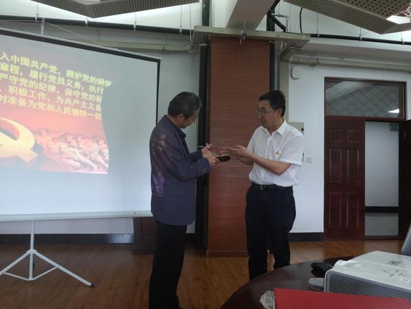 学院党委书记靳雪滨为几位过“政治生日”的同志赠送了纪念品摆件和书籍,在欣喜和感动中,大家回忆起了入党几十年来的心路历程,并表示在今后的工作中会继续发挥共产党员的先锋模范作用,不忘初心,牢记使命。喜爱毛泽东诗词的张贺新老师更是有感而发,写下了“廿载春秋寒与暑,教书育人文章著。复兴之路跟党走,往圣继学华夏固。信仰精神指我行,初心使命促前赴。蓬蒿尽沃贫瘠土,养成棵棵参天树。”