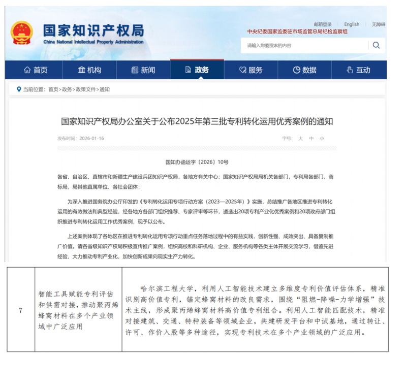 近日,国家知识产权局公布了2025—2027年国家知识产权强国建设示范创建对象和2025年第三批专利转化运用优秀案例评选结果,我院案例《智能工具赋能专利评估和供需对接,推动聚丙烯蜂窝材料在多个产业领域中广泛应用》入选“2025年第三批专利转化运用优秀案例”,是黑龙江省唯一入选案例。