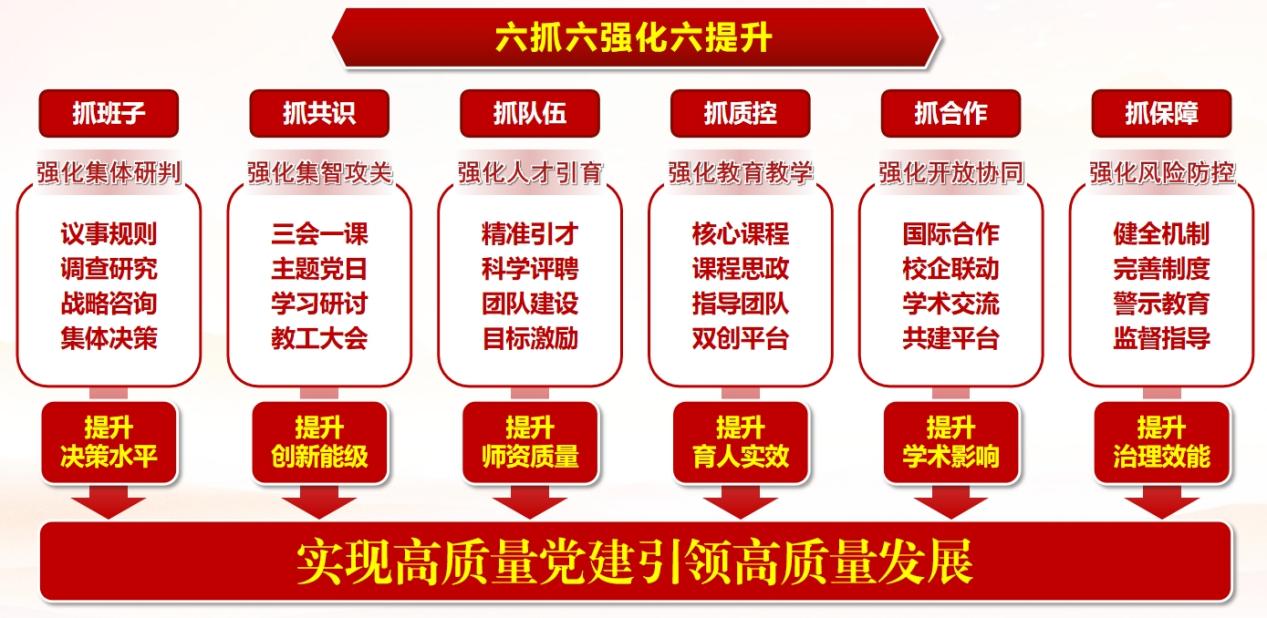 建立联动机制,激活党建业务融合引擎。以落实学校党委“五维一体”党建业务融合理念为指引,探索“六抓六强化六提升”工作模式,将党建工作与学科建设、人才培养、科研攻关等中心工作同谋划、同部署、同考核,以高质量党建引领高质量发展。