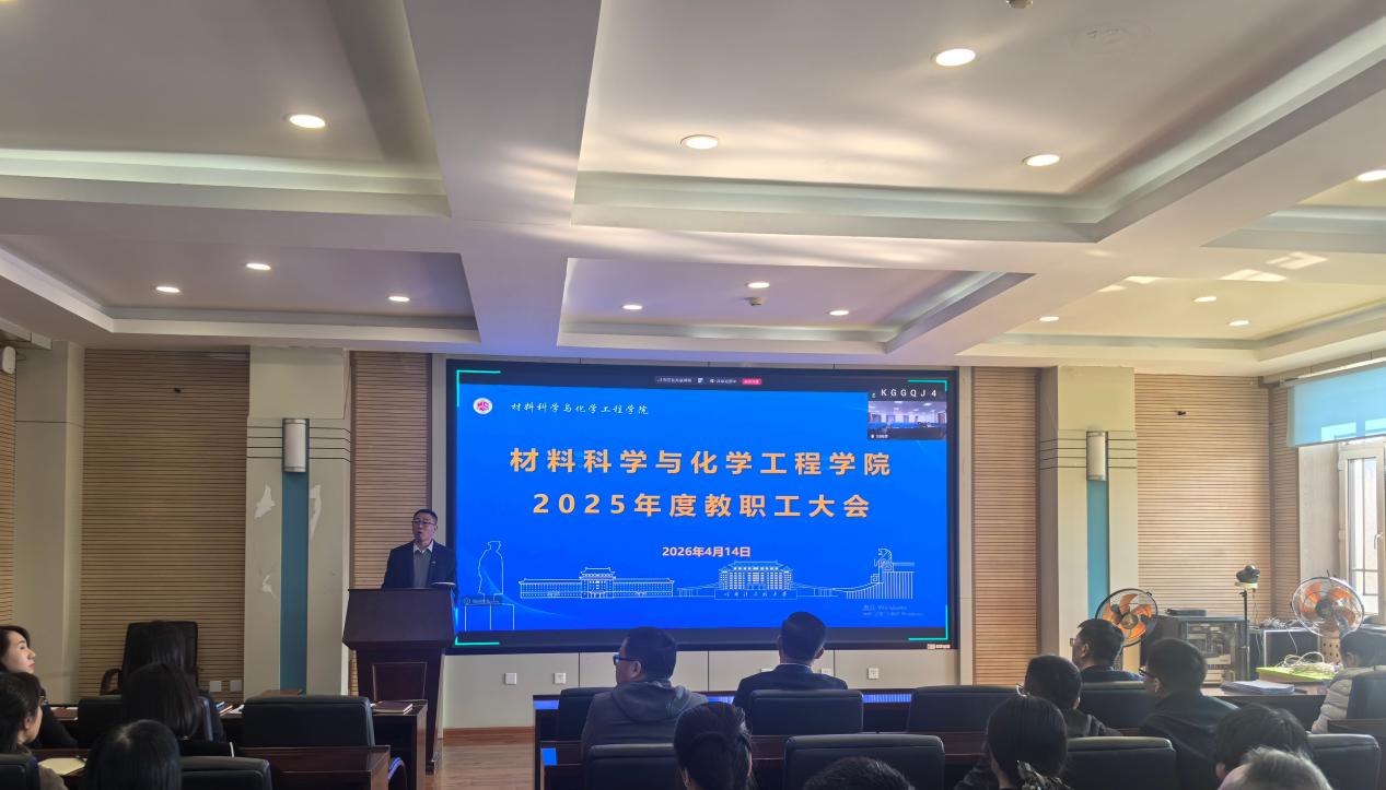 2026年4月14日下午,材料科学与化学工程学院在材化楼433报告厅召开2025年度全院教职工大会。会议由学院党委书记王嘉男主持,学院领导班子和全体教职工出席会议,青岛创新发展基地教职工线上参会。大会听取并审议通过了《材料科学与化学工程学院2025年工作报告...