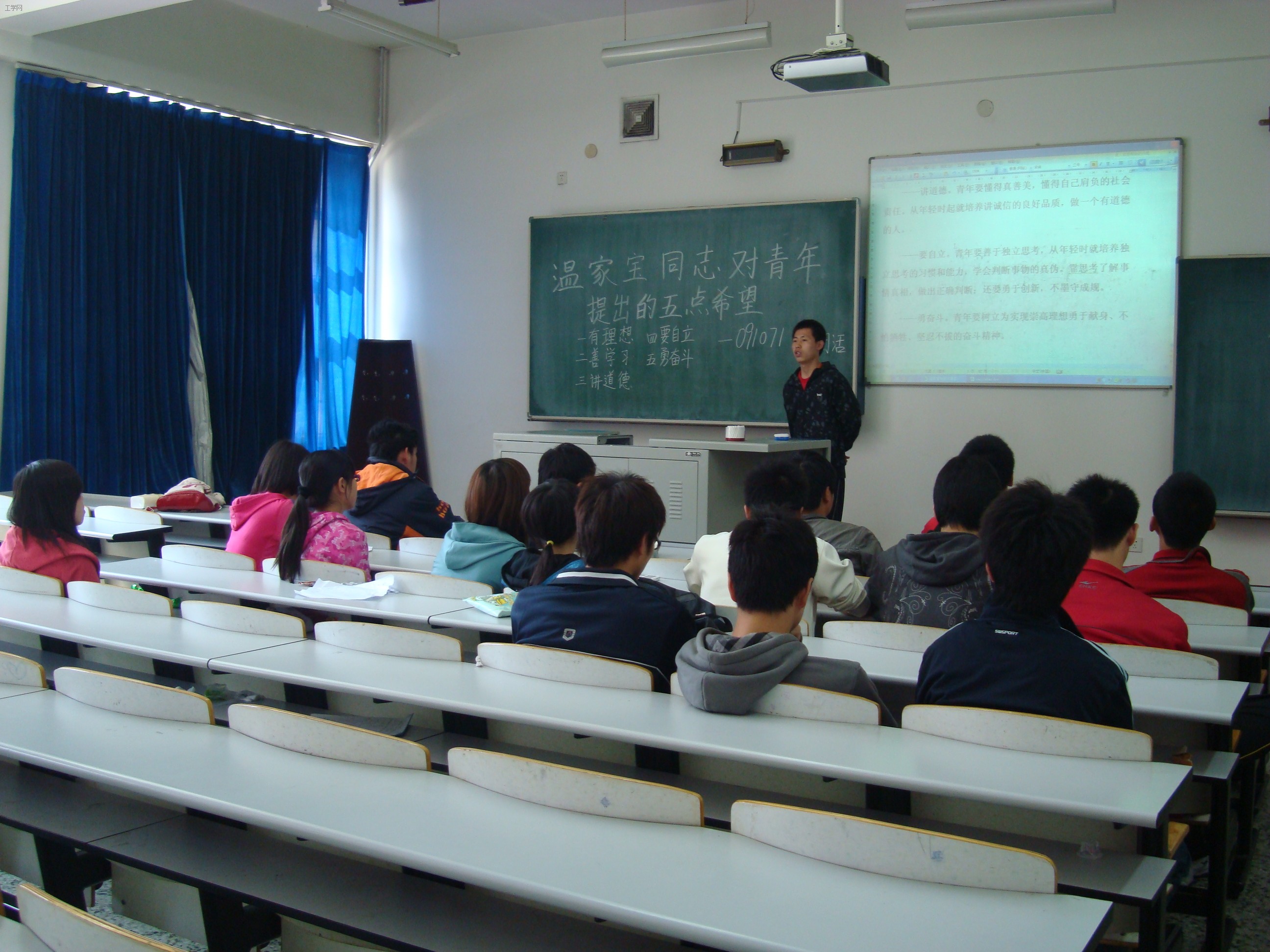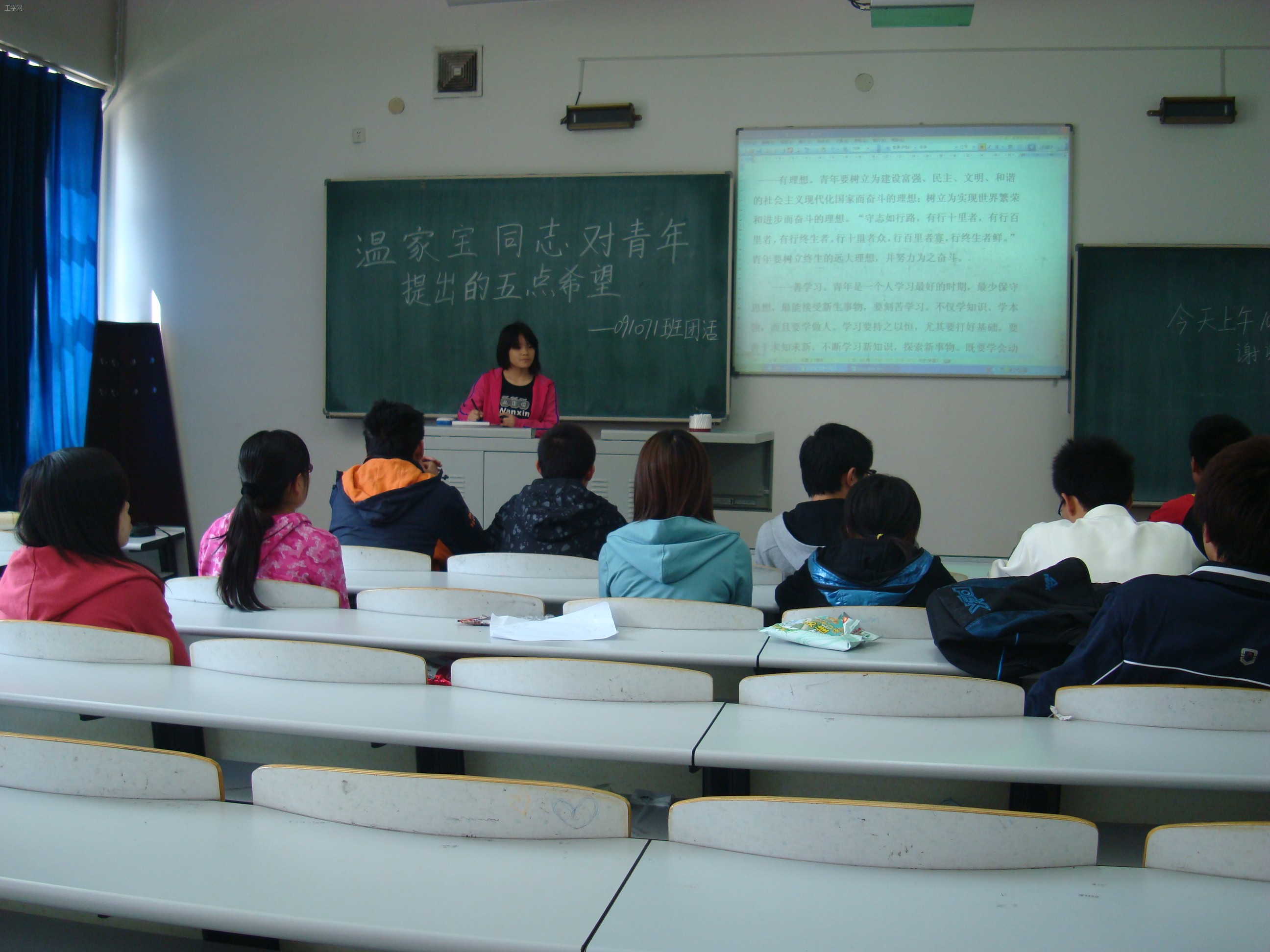 活动中,团支书用多媒体向同学们展示了温家宝同志对青年提出的五点希望的具体内容以及相关新闻报道。观看后,同学们积极踊跃的发言,向其他同学表达自己的观点。
